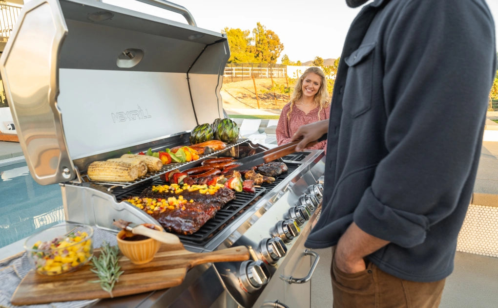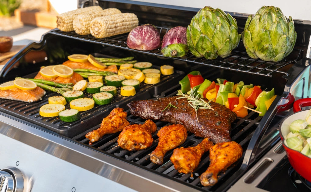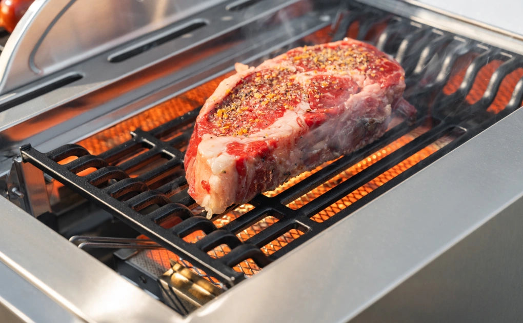 Classic flame grilling over heavy-duty cast iron grates. No griddle plate required. Simply ignite, cook, and enjoy.